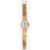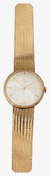 the circular silvered dial with raised gilt baton numerals, with textured bracelet marked 375 on the clasp, contained in a fitted case