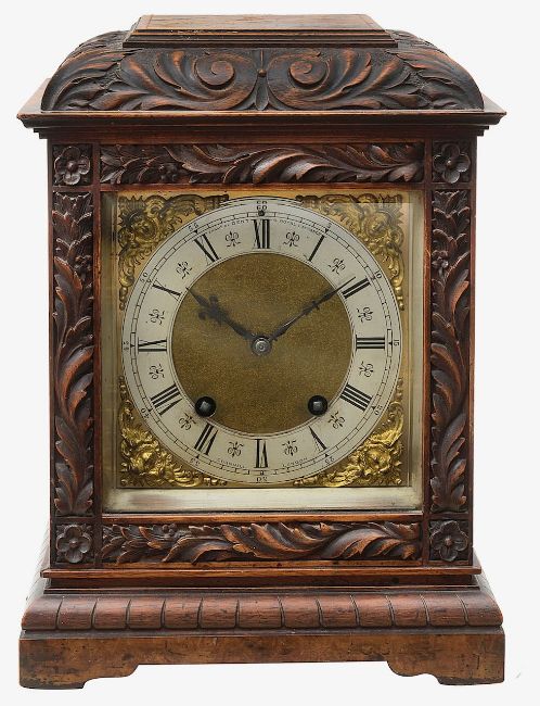 the 5 3/4" square brass dial with silvered chapter ring with Roman numerals, minute track, outer Arabic minutes, steel hands and gilt mask and scroll spandrels, inscribed Exam'd by Dent 4 Royal Exchange Cornhill London, 8 day brass movement striking on a two coiled gongs, backplate stamped Lenzkirch and numbered 133076, the case with foliate carved pediment above an acanthus leaf and foliate carved glazed door,