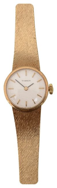 A 9ct gold lady's Tissot bracelet wristwatchthe silvered circular dial with baton numerals, manual wind, textured strap with clasp marked 375total weight approx 26.7gCondition: The gold strap has a very slight clink. Movement not tested or guaranteed.Crystal detached but present.