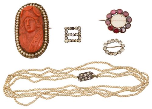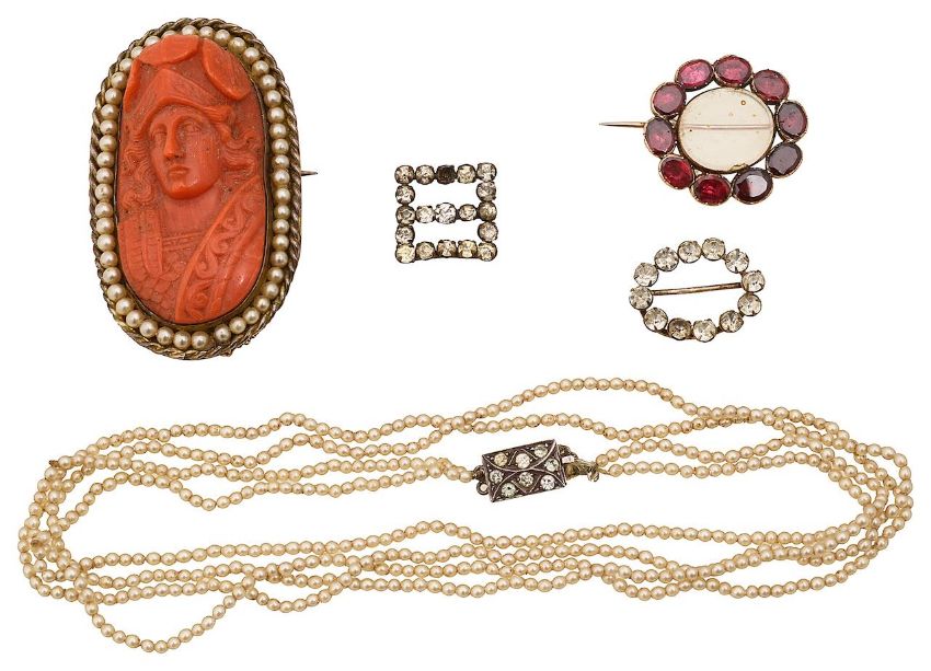 Georgian circular garnet brooch, flat cut garnets bezel set to a closed back setting, surrounding a sentimental compartment; a coral cameo brooch, depicting Athena, set above a pearl and twisted rope border, with safety chain; double strand of pearls, with a colourless paste set clasp and two colourless paste set buckles (5)