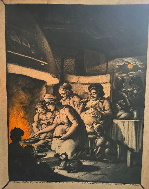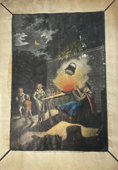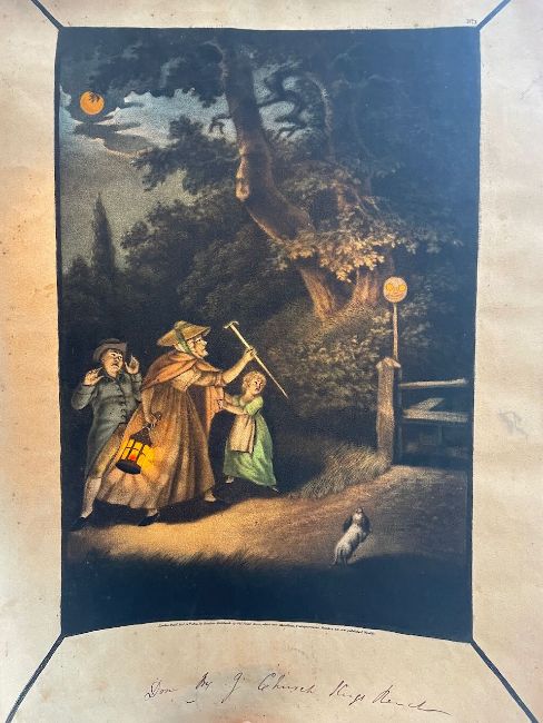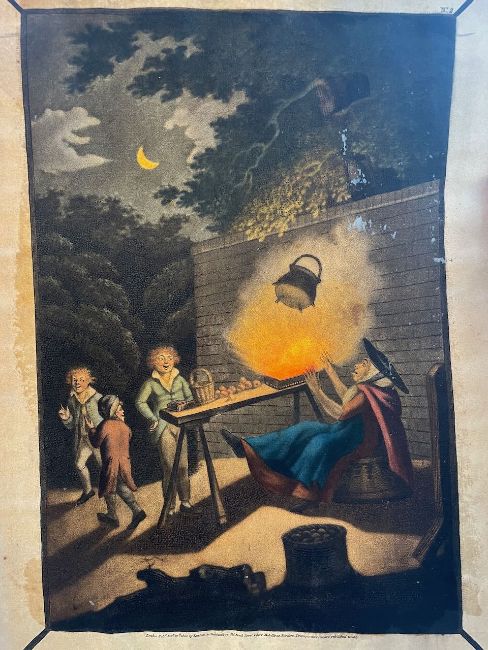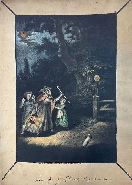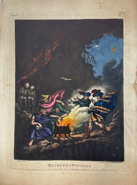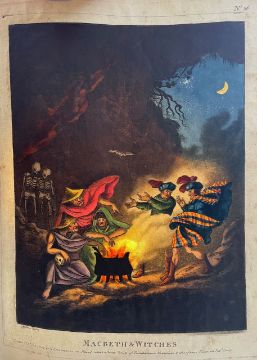 comprising after Holmes engraved by Jenner, No 36 'Macbeth & Witches 'and another untitled of an interior scene of figures round an open fire, both London, 1799 Ackermann together with two other No.1 'The Turnip Lantern' one of an old woman accompanied by two frightened children shaking her stick at. ghoulish lantern on a pole, the other and No 2. 'The Baked Apple Woman' of three boys laughing as an old woman sitting at a table falls backwards as her cooking pot explodes, both London, 1800 Random & Stainbank, (4)
