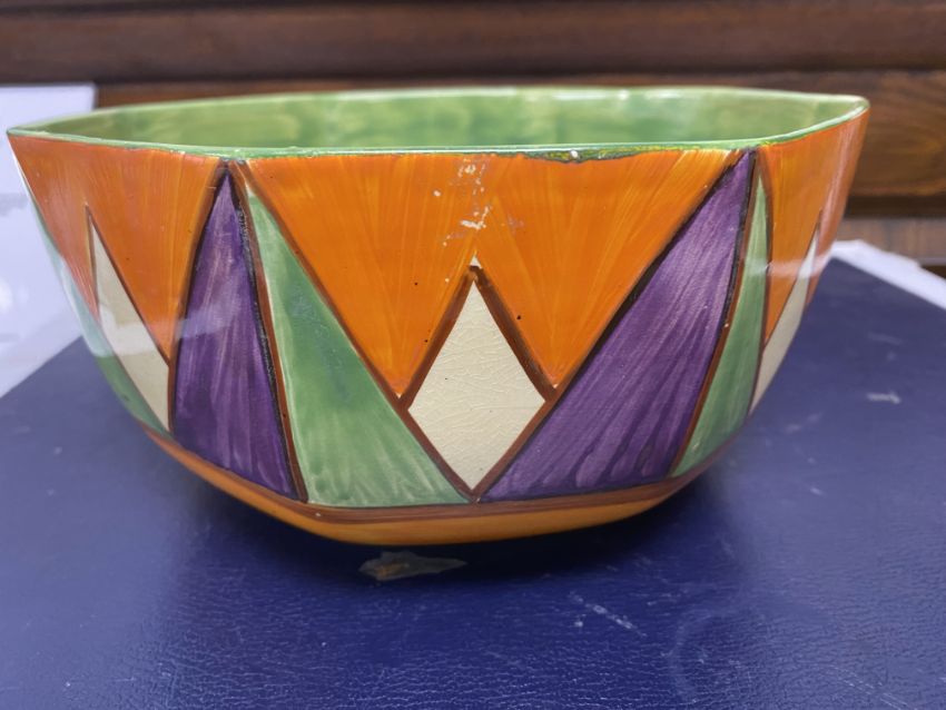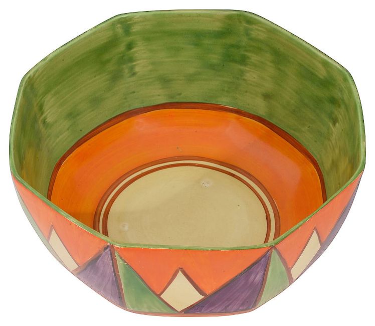 A Clarice Cliff Newport pottery Bizarre octagonal bowl hand painted with geometric design of triangles in orange, purple and green, printed Bizarre marks in blackdiameter 21cm.Condition:an interior hairline (see picture), crazing, occasional scratches and minor losses to painted decoration visible on close inspection