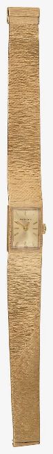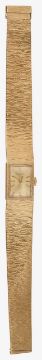 the rectangular gold coloured dial with raised baton numerals, textured gold bracelet with clasp stamped 375, with pouchette, outer box and guarantee