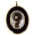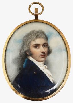 portrait of a gentleman facing right wearing a blue coat, stock and cravat, watercolour on ivory, oval double sided gold frame with reverse with central hair spray with seed pearl set tie against an opaline glass ground within a blue guilloche enamel border