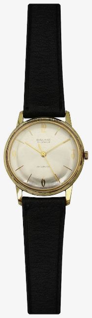 circular silvered sunburst dial with gold hour markers, Arabic quarters, gold pencil hands and centre seconds, signed Baume, 21 jewels incabloc automatic movement, stainless steel back, leather bracelet