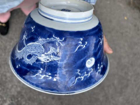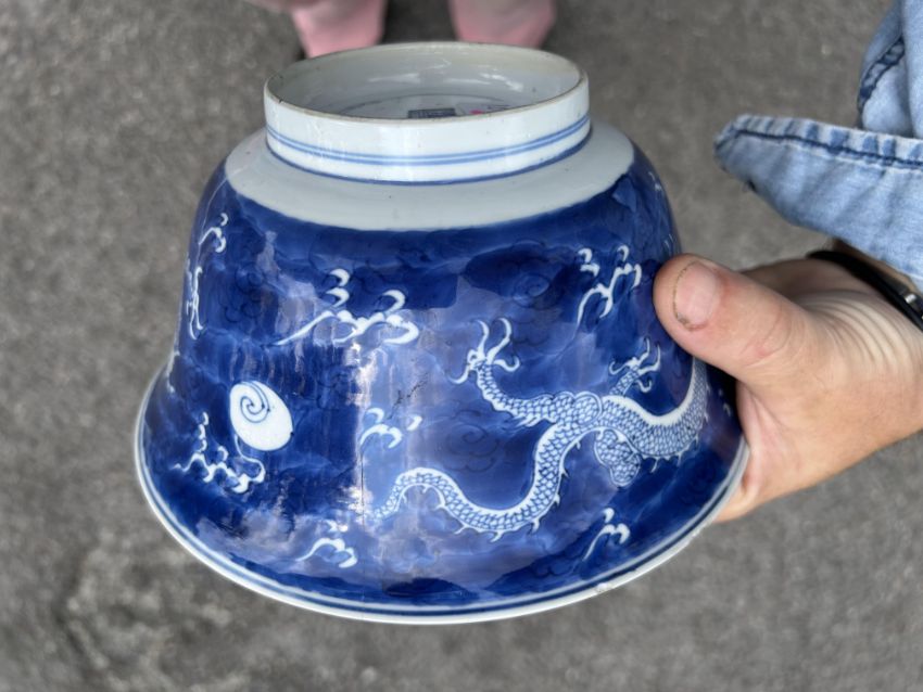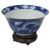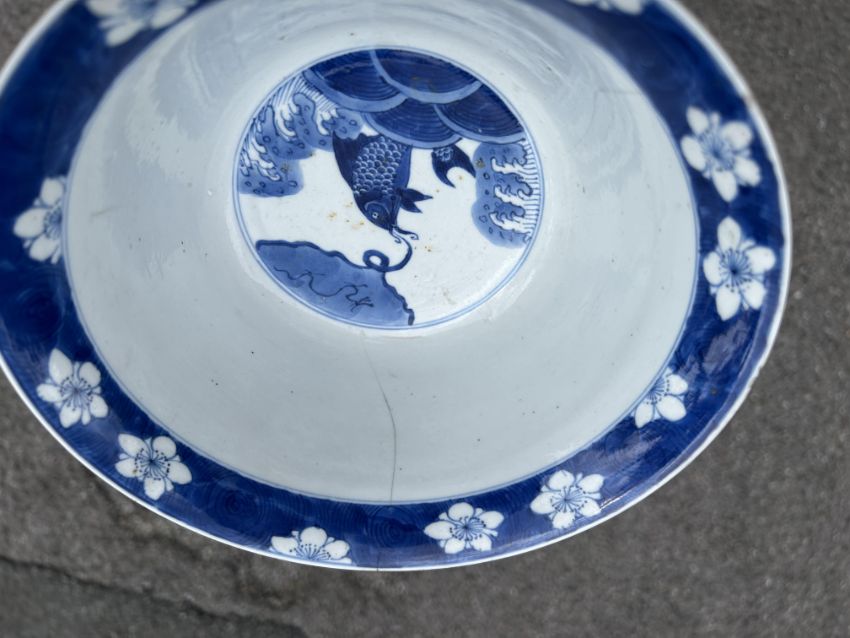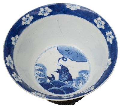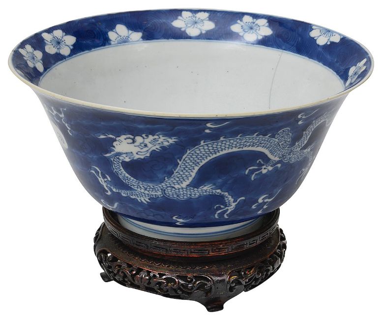 of tapering form with everted rim, the exterior decorated with two dragons chasing the flaming pearls against stylised clouds and flames, the interior with prunus border and painted to centre with a leaping carp, on a circular foot, underglaze blue seal mark within two concentric rings, on an associated hardwood stand