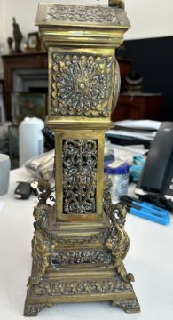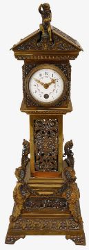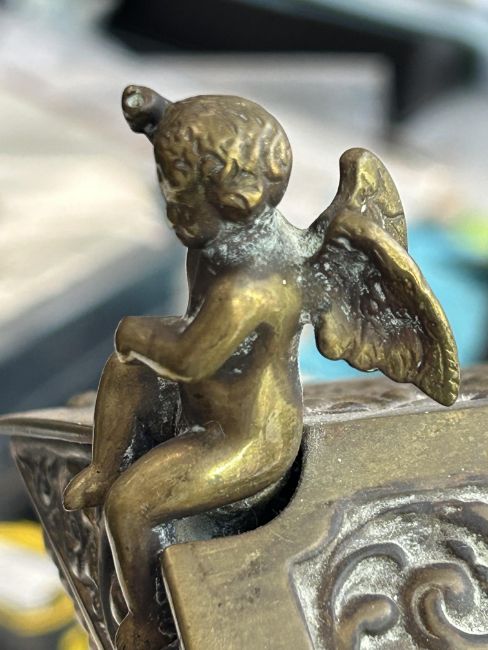 Condition: No key present. Movement untested. Small chip to enamel on dial at 10 o'clock. this is only apparent when door is open. Putto finial probably held a torch originally. Otherwise in fair condition commensurate with age