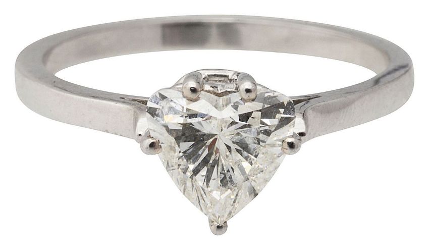 A diamond heart shaped single stone ringthe heart-shaped brilliant estimated to weigh 1.25 cts approx claw-set above the plain shank, numbered '4835'ring size P, 3.2gCondition: Overall condition good - little sign of weardiamond measures 7.1x6.7x4.4mm approx Colour I/J, clarity VS