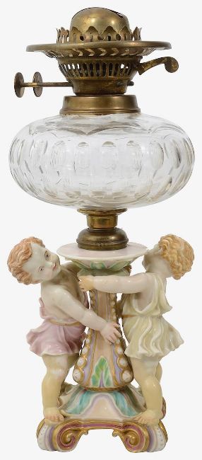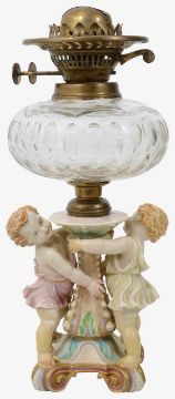 Condition: Professional restoration to both legs and feet of each child which has discoloured with age. Child in white clothing in addition has extensive discoloured restoration to the right arm, chest and left hand. Child in pink clothing in addition has discoloured restoration to the left hand and chip rear edge of tunic. The glass reservoir is in good order overall. The oil lamp mechanism needs some attention.