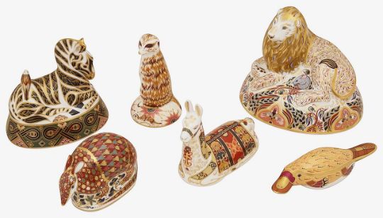comprising a large Lion, second quality silver stopper, an Exclusive Signature Edition for Harrods designed by John Ablitt, a Zebra, silver stopper, a Duck-Billed Platypus from The Australian Collection, gold stopper, boxed with certificate, a Llama, An Exclusive for The Royal Crown Derby Collectors Guild, gold stopper signed in gold and dated 2001, boxed, a Meerkat, gold stopper and an Armadillo, silver stopper, boxed, (6)
