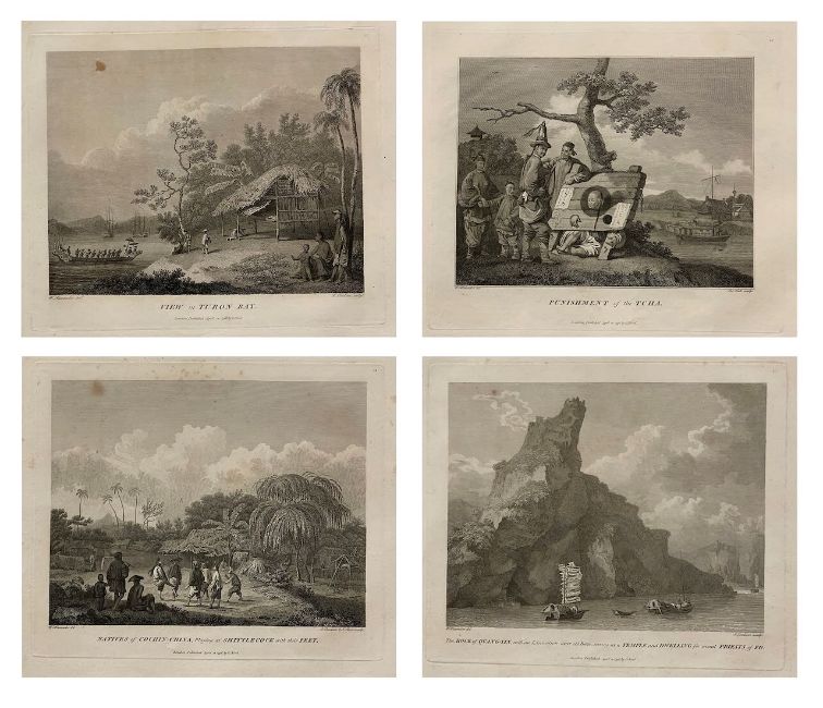 comprising Sydenham Edwards del: 'The Pelicanus Sinensis or Fishing Corvorant of China' and 'The Fire-backed pheasant of Java', together with William Alexander del: 'The Rock of Quang-Yin, with an Excavation near its Base, serving as a Temple and Dwelling for several priests of Fo', 'Natives of Cochin-China, Playing at Shittlecock with their feet', 'Punishment of the Tcha' and 'View of Turon Bay', published 1796 by G.Nicol, (6)