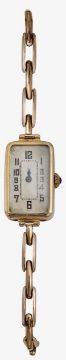 rectangular silvered dial with black Roman numerals and minute track, winding crown set with blue cabochon, Glasgow import marks for 1924, expandable sprung bracelet stamped 9ct B 2 R Britannic