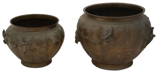 Condition: The larger jardiniere with crack to base, the underside with glued penny. The smaller without cracks or holes but with water residue to interior. Condition commensurate with age