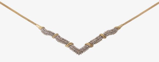 central section comprising of hinged panels, consisting of three rows of diamonds, to a flattened snake-link chain, stamped to clasp "10K"