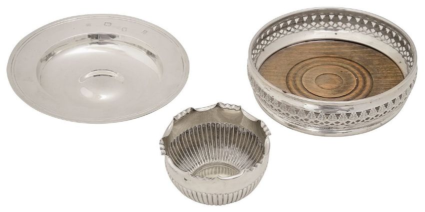 first London, 1963, William Comyns & Sons, typical from with feature marks, second London, 1989, D J Silver Repairs, with pierced sides and turned wood base, third Sheffield, Sheffield, 1893, James Dixon & Sons, (3)