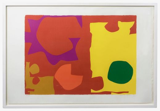 Patrick Heron (British, 1920-1999)"Six in Vermillion with Green in Yellow", original screenprint, signed bottom right, dated 1970, numbered 68/100, framed and mountedimage size 58.5 x 77.5 cm., overall size 78 x 108 cmCondition: In good condition. Picture retains colour and vibrancy. 3 very minor spots, possibly foxing to surface on upper, left & bottom margin. Very faint surface mark upper left-hand side: no colour loss and no ink loss. Item not examined out of the frame. Therefore, we cannot guarantee the method in which it has been stuck down. However, it would appear most likely that artists tape has been used. Reframing will not affect the quality of the paper.The label verso; Leonard Villa Frame Makers & Gilders.