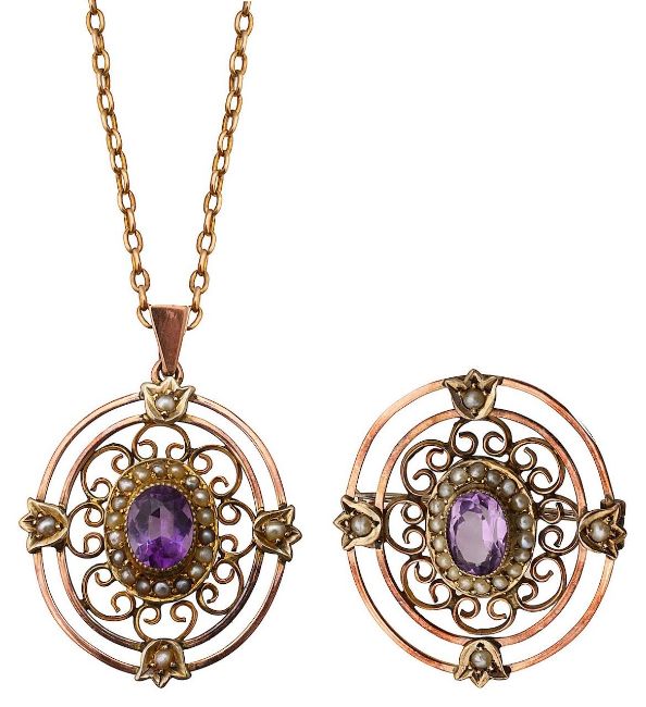 central oval mix-cut amethyst, bezel set within an seed pearl border, to an scrolling open-work mount, with seed pearl set floral motifs, suspended on a fine trace-link chain, stamped "15ct" to tag together with a brooch of similar design (2)