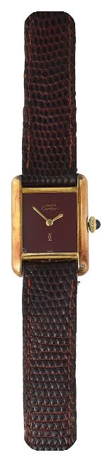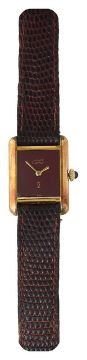 rectangular burgundy dial with gold sword hands, signed Must de Cartier and bearing Cartier Logo, manual wind movement with blue cabochon set winding crown, caseback signed Cartier Paris 925 and numbered 3 240918, black lizard bracelet with plated buckle, accompanied by guarantee dated 1982 and other booklets in red leather wallet, contained in a gilt tooled red leather box stamped Cartier with outer card box