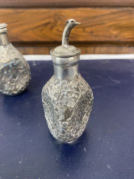 comprising two Chinese export bitters bottles, one overlaid with pierced flowering prunus, stamped sterling with monogram the other three scrolling dragons and clouds, stamped China, Zung Li, the other decorated with thistles, (3)
