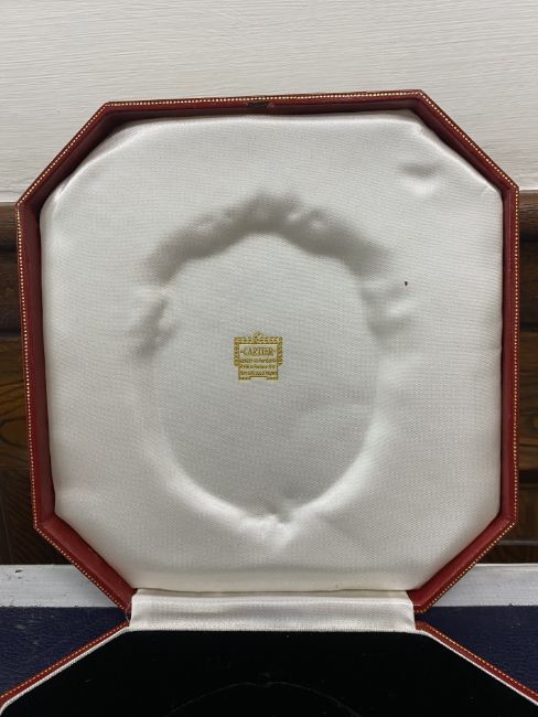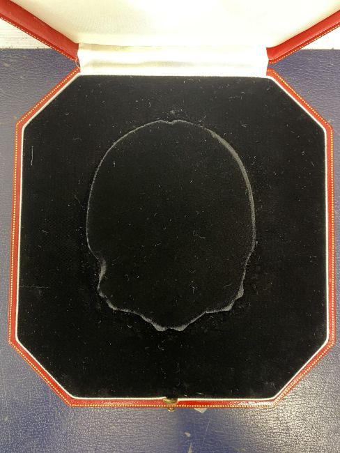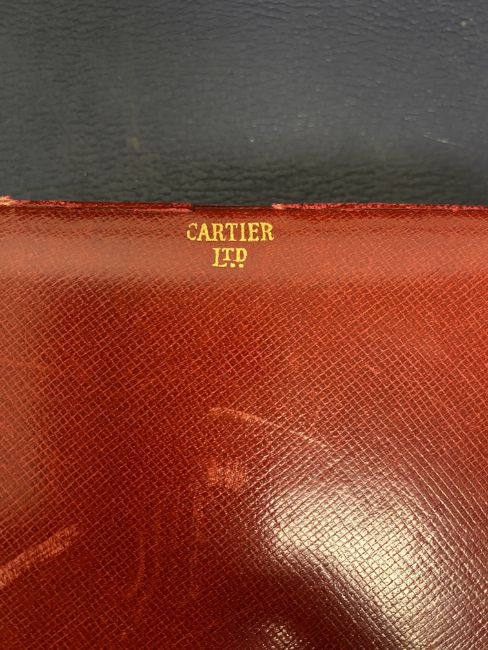 for a necklace, truncated square, of red leather with gilt details, velvet and silk interior, stamped Cartier Ltd