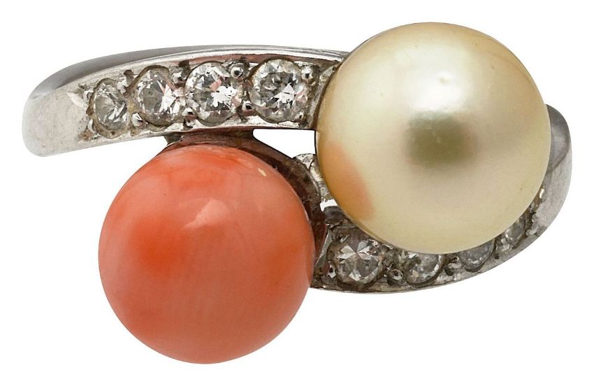 An early 20th century cultured pearl, coral and diamond-set cross-over ring