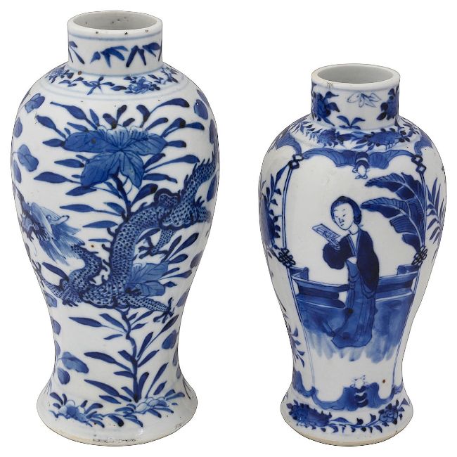 first of inverted baluster from, decorated in underglaze blue with a pair of scrolling dragons, underglaze blue four character Kangxi mark, second of inverted baluster form, decorated with alternating panels of a figure reading a letter on a terrace and a flowering prunus branch with a bird, underglaze blue four character Kangxi mark,