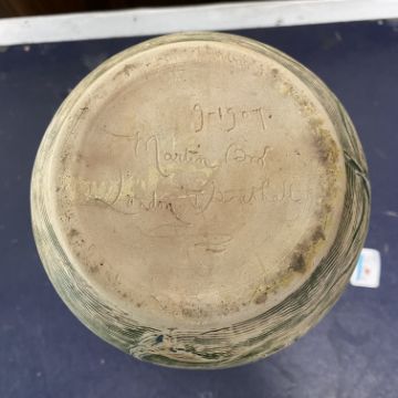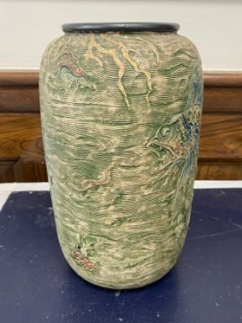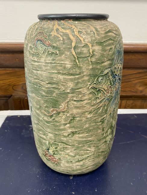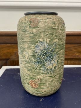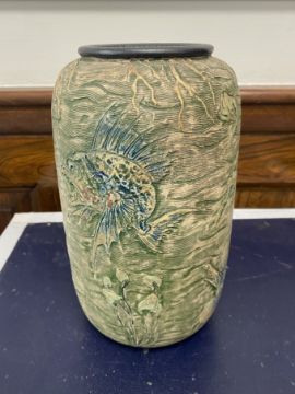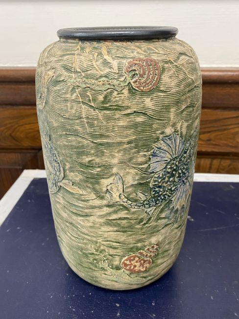 of shouldered cylindrical form, relief moulded and sgraffito decorated with grotesque fish and sea creatures on a watery ground, including fish, molluscs and jellyfish in blue and brown, incised 9-1907 Martin Bro London + Southall