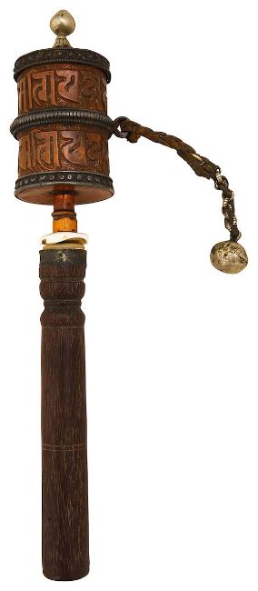 A Tibetan silver mounted brass Bhuddist hand prayer wheel (mani)