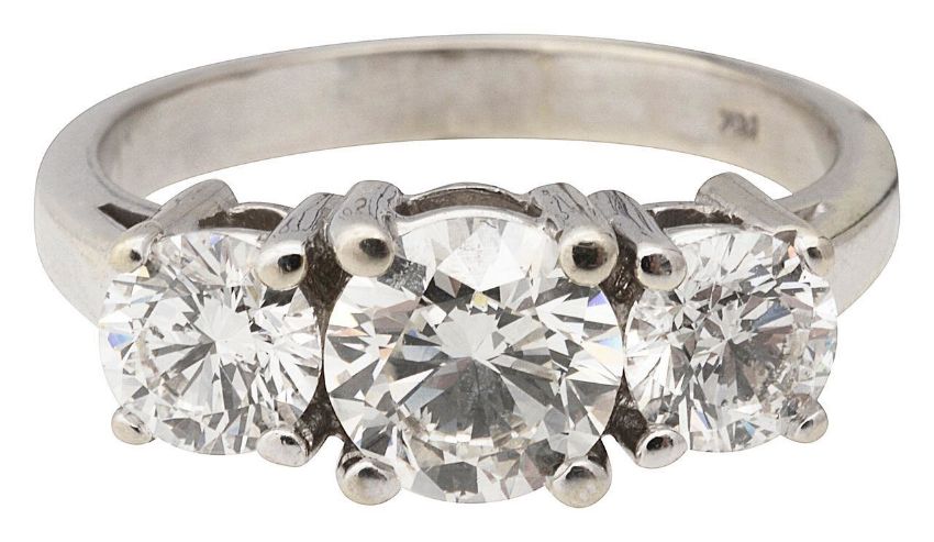 the central brilliant-cut diamond weighing 1.29cts set to either side with a brilliant-cut diamond, each estimated weigh 0.55cts, to the plain shank stamped '14K'