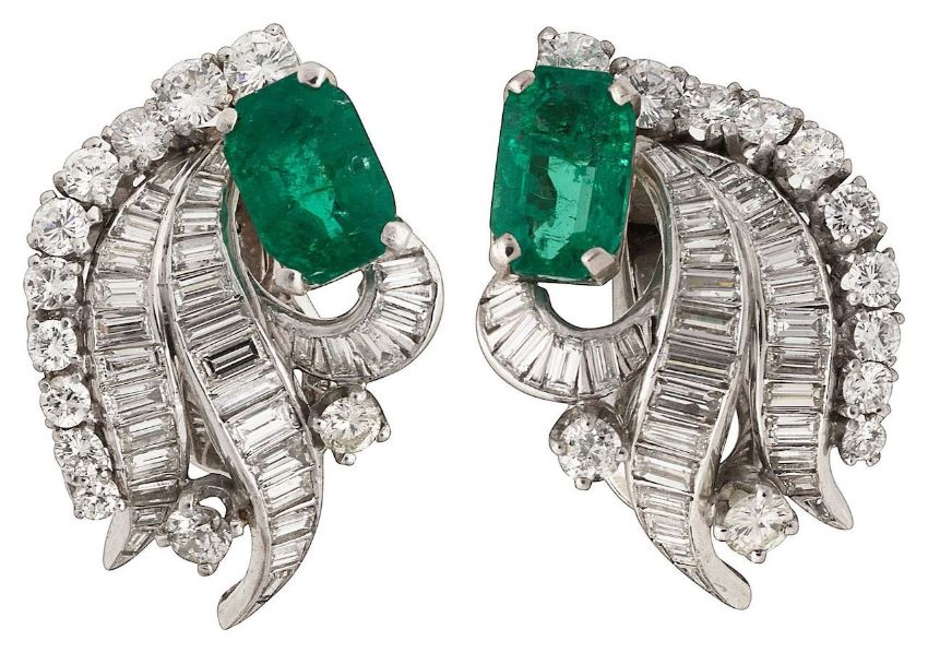 each set with a rectangular cut-corned emerald to the ornate linear scrolls set with tapering baguette-cut and brilliant-cut diamonds, the post clip fittings stamped '14K'