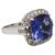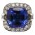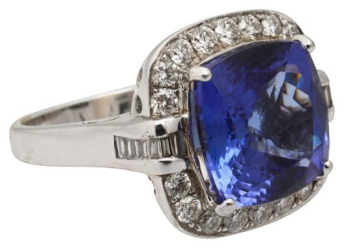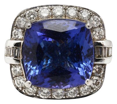 A tanzanite and diamond-set cluster ringthe central cushion-shaped mixed-cut tanzanite measuring 12.18 x 12.6 mm (culet inaccessible) to the brilliant-cut diamond-set border with baguette diamond-set shoulders, the shank stamped '750' (partially by pip)ring size K (with pips) , 10.4gCondition: Overall condition good/very good.Tanzanite bright rich blue with purple overtones.