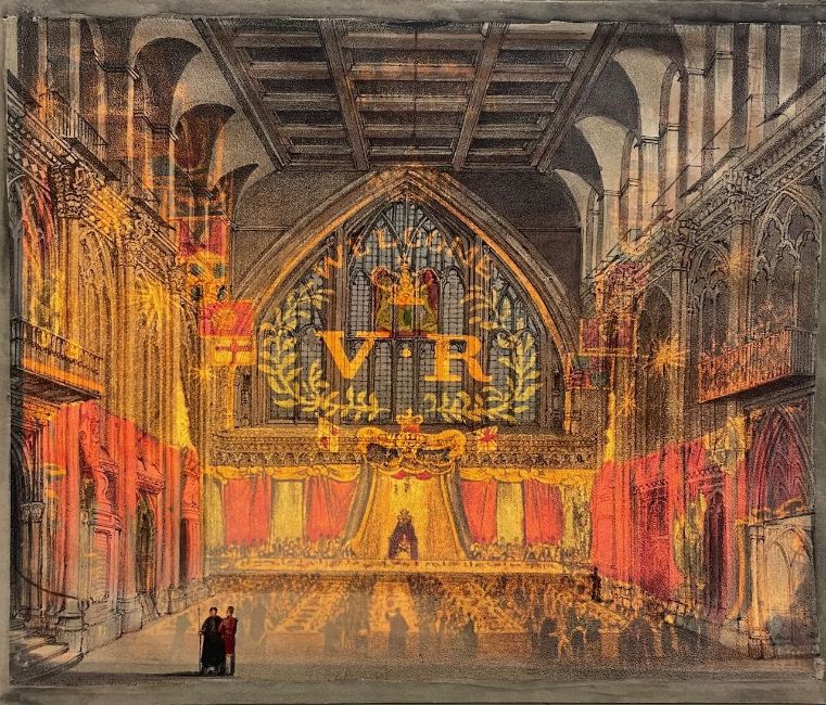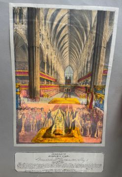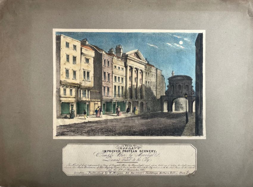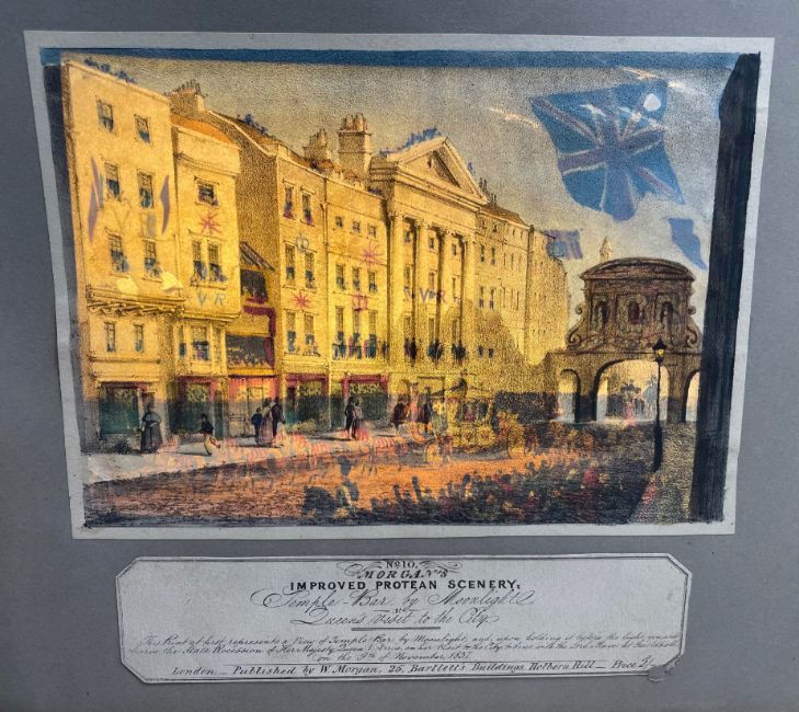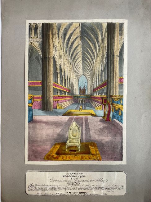 comprising 'Mount Vesuvius' published by Morgan, 1837, 'Mount Vesuvius' published W. Spooner, Morgan's Dioramic View of Coronation at Westminster Abbey, Morgan's Improved Protean Scenery: No 10 Temple-Bar by Moonlight / Queens visit to the city and No 11 Cloister of St Juan with torch, Relfe's Protean, No. 2 York Minster, west front. changing to a view of the Minster in flames as it appeared on the 30th May, 1840, Eales' Dioramic views: No 3 Swiss Village, No 12 Rheims Cathedral and Gypsies in a ruined Abbey, G.W.'s Dioramic Views No2. a Village destroyed by an Avalanche, published by Reeves, all mounted on card with captions and tissue backed, together with an anonymous series of ten views mounted on card, tissue backed A ruined church with witches at night, Queen Victoria banqueting in Westminster Hall, an Alpine scene with a village being overwhelmed by an avalanche,