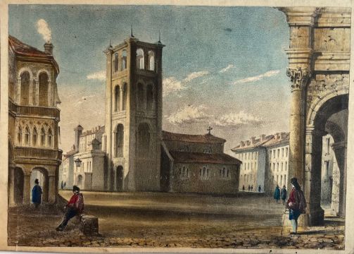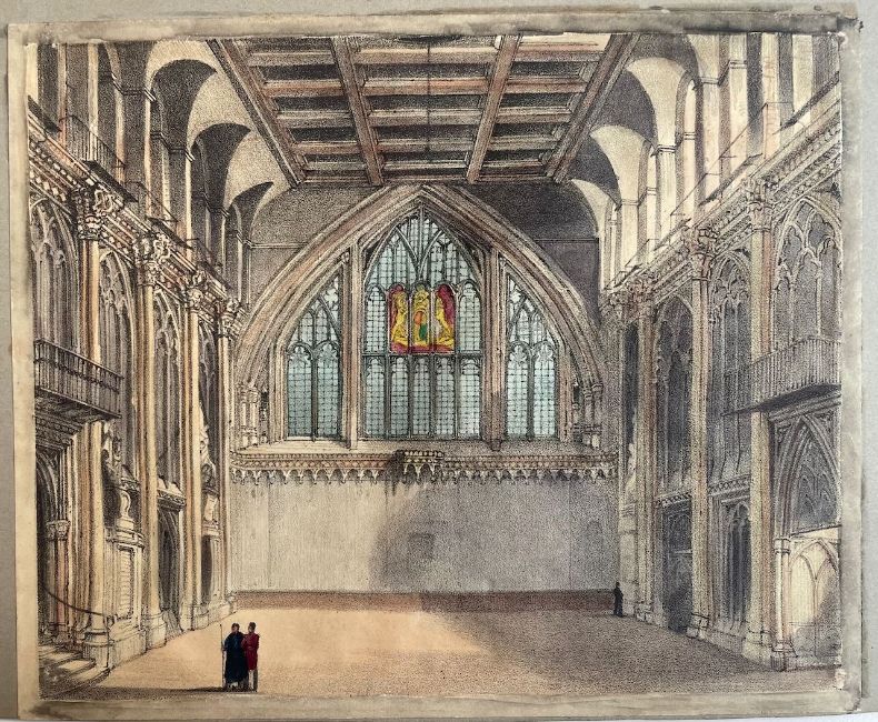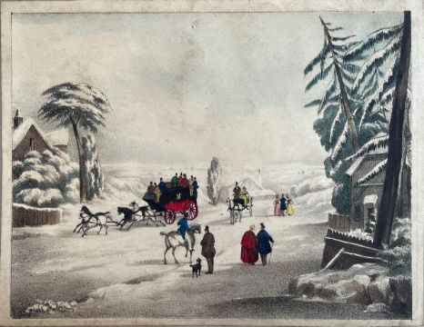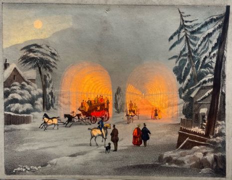 a snow scene with a stage coach and Thames Tunnel, Gypsies in a Ruined Abbey, a Spanish street scene with Auto da Fe, Wedding in a cathedral, Penitents in a cathedral and the Eglington Tournament, (20)