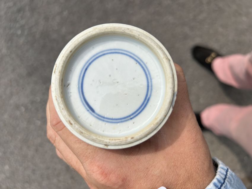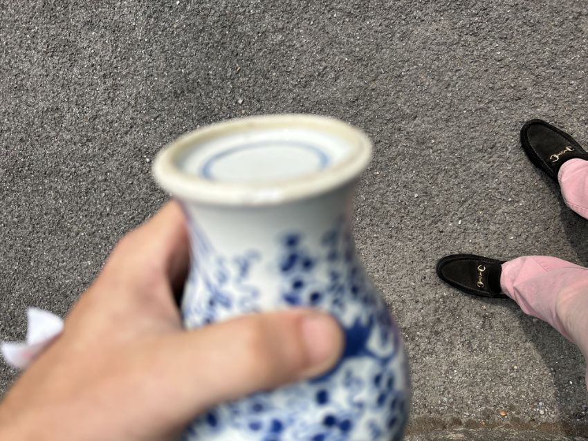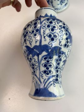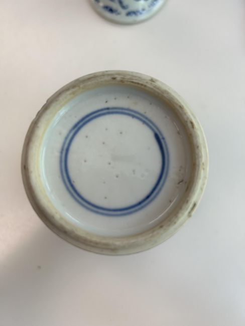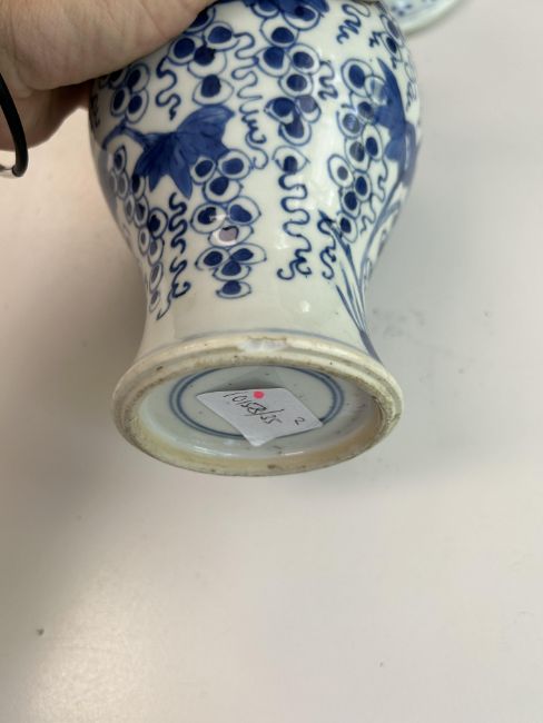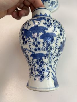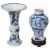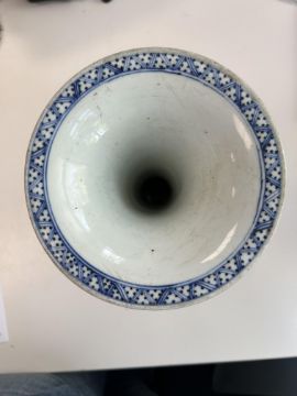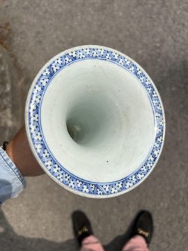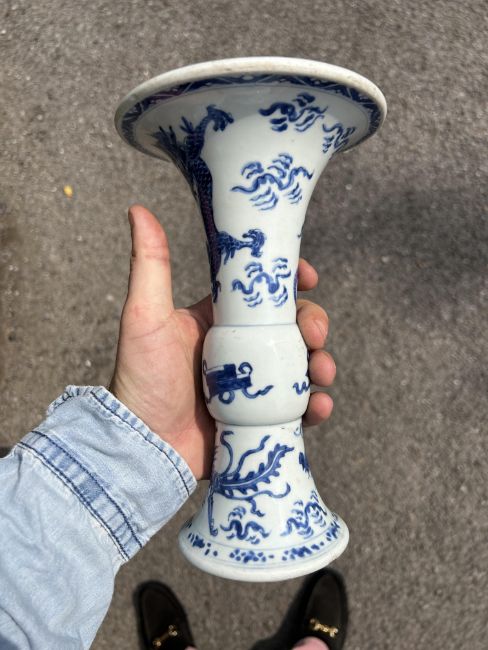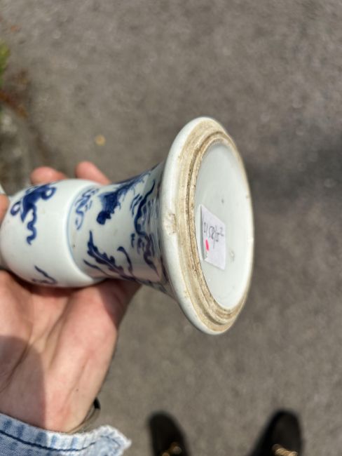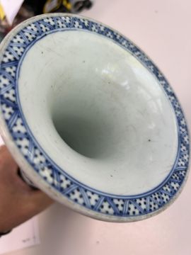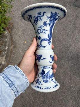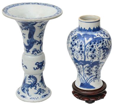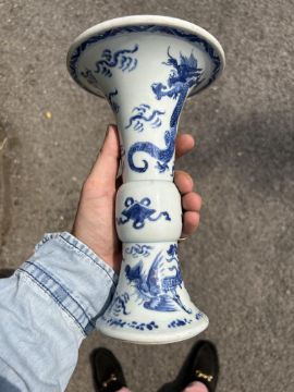 A Chinese blue and white porcelain Gu shaped Dragon and Phoenix vase and anotherlate 19th / early 20th centuryfirst decorated with two dragons over a band of precious objects and a phoenixes below, second of inverse baluster from decorated with fruiting vine, underglaze blue concentric double rings associated hardwood stand, (2)first height 23.3cm., second height 18.2cm.Condition: First scratches and wear to inside of vase and around rim. Small chip to surface of glaze on foot edge. V small chip to glazer on rim edge. Second small chip to foot rim. Both free from hairlines.