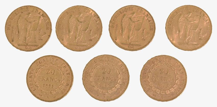 Fr. 3rd Republic, Seven gold 20 Francs, 1895 x3, 1896 x2, 1897, 1898, (5)