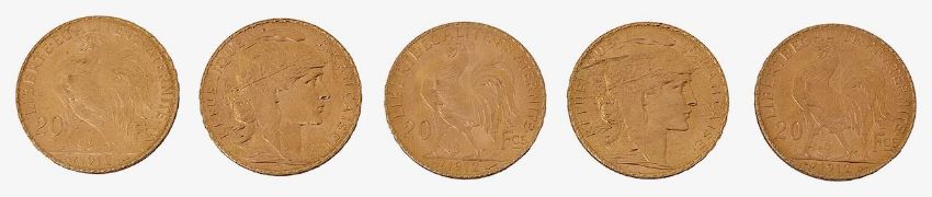 France. 3rd Republic, Five gold 20 Francs, 1912, (5)
