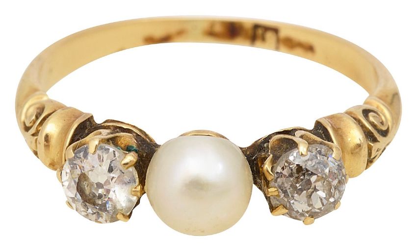 central pearl (untested) set between two white gemstones, to chased scrolling shoulders, tapering to a plain shank, stamped "18ct"