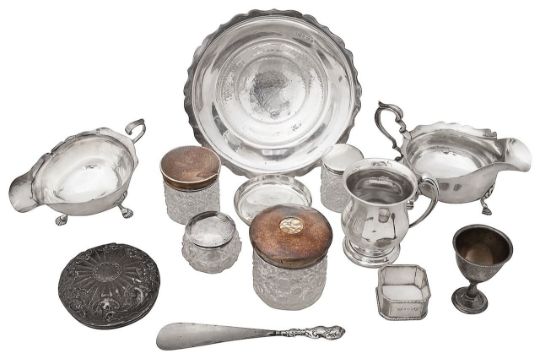 first Birmingham, 1907, Norton & White, circular dished form, planished to centre with wavy edged rim on a weighted foot, together with a christening mug, Birmingham, 1925, Mappin & Webb, engraved Tony 22nd May 1926, a sauce boat of typical form with wavy edged rim and scroll handled on shell capped legs and stepped hoof feet, Birmingham, 1921, Jays, another sauce boat, a plain pin dish with feature hallmarks, an egg cup, an engine turned napkin ring, four hobnail cut glass jars with silver lids, , etc., (qty)