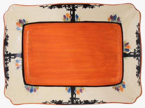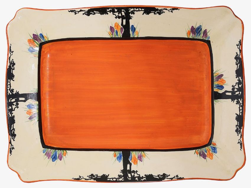 hand painted with a central orange field within a border of Crocus flowers and transfer decorated with stylised trees in black, printed Bizarre mark, hand painted 5850