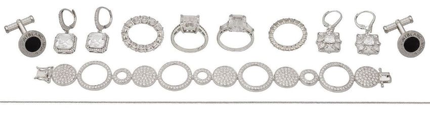 cubic zirconia and silver bracelet, pave-set round brilliant-cut cubic zirconia to a circular design frame, stamped with hallmarks; two pairs of cubic zirconia ear-pendants; two cubic zirconia set eternity rings; two cubic zirconia dress rings; a pair of circular cufflinks by Mont Blanc and a fine curb-link chain (qty)