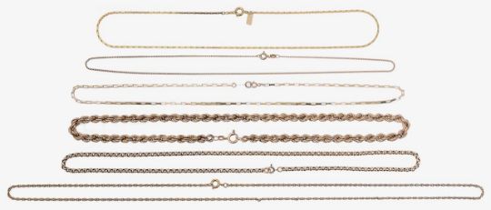 9ct gold twisted rope chain, stamped with hallmarks to tag; 9ct gold box link chain, stamped with London import marks; a fine belcher chain; a rope chain; a fine curb-link chain and fine cobra chain (6)