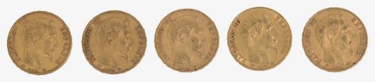 France. Napoleon III, Five gold 20 Francs, 1857, 1859 x 2, 1860 x 2, (5)