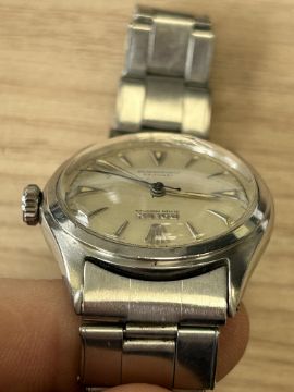 the circular cream dial with raised silver dart hour markers with luminous inserts on the quarters and dot markers, minute scale, silvered hands with luminous inserts and centre seconds, signed Rolex oyster perpetual officially certified chronometer, the winding crown signed Super Oyster Rolex, case numbered 802528 6106, automatic self winding movement, stainless steel tapering Rolex expansion bracelet