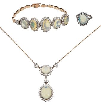 An opal parurecomprising a two stone drop pendant necklace to the fancy link back chain, a graduated five stone and oval link bracelet, a ring and a single earring, each set with oval opal cabochons within a border of white stones, casedring size L; pendant: overall length 4.1cm; bracelet length 17.5cm; combined weight 21.3gCondition:Overall condition good.Opals: well matched. Translucent, mostly greens and blues. Ring cabochon slightly flatter/less domed and with a small nick near centre .Earring: screw fitting terminal detached