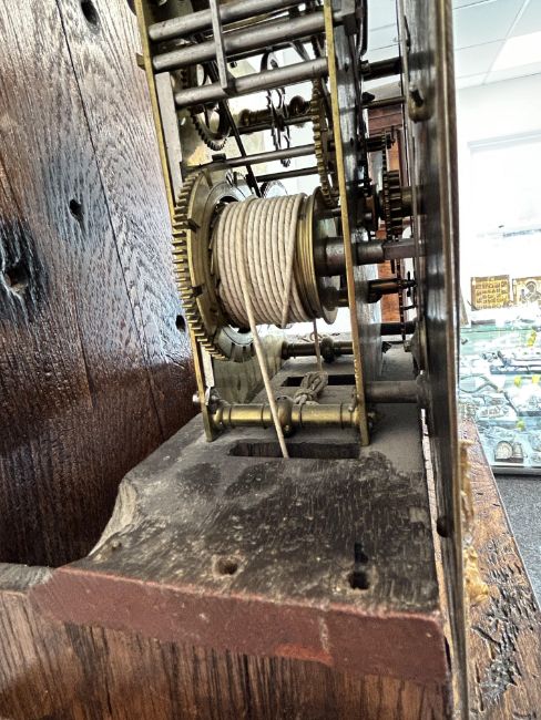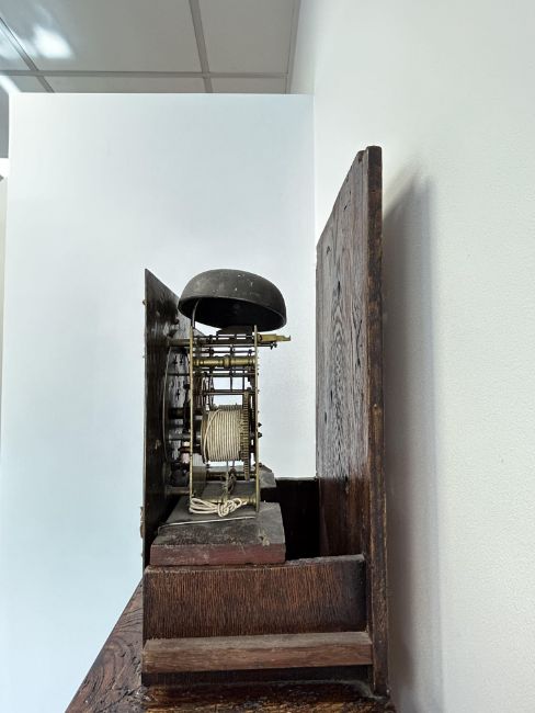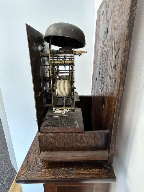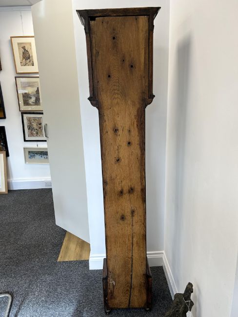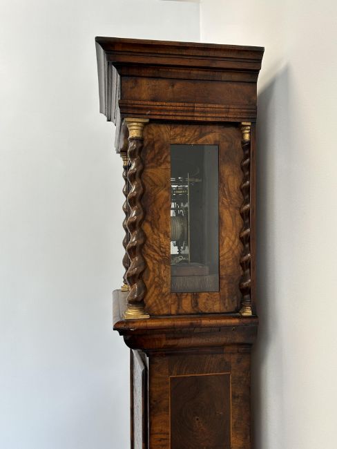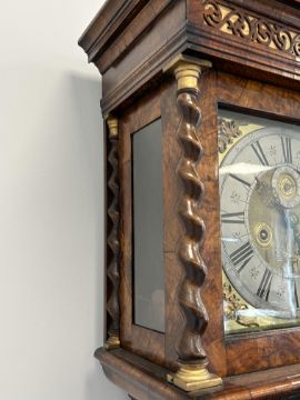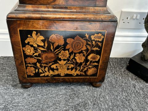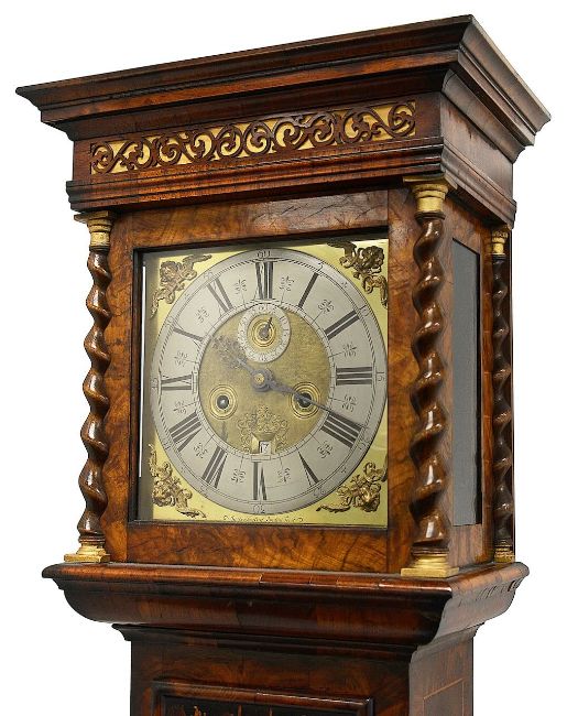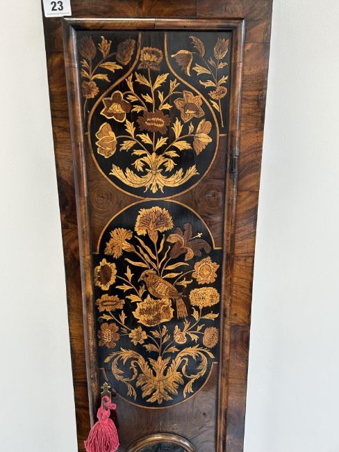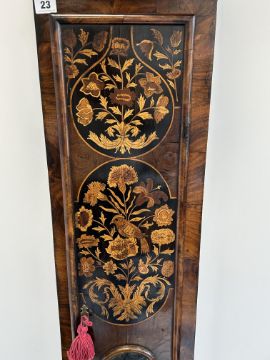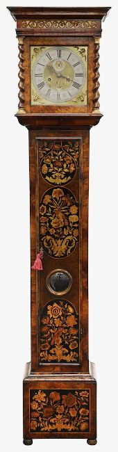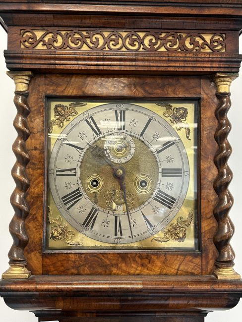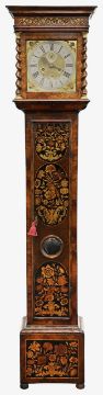 A William III walnut, marquetry and oyster veneered longcase clock by Jasper Taylor Londonlate 17th centurythe 10" square dial with silvered chapter ring with Roman numerals, minute track and outer Arabic minutes, subsidiary seconds dial, date aperture and winged mask spandrels, signed Jasper Taylor Londini Fecit, 8 day 5 pillar brass two train movement striking on a bell, the hood with a flat stepped moulded cornice over a pierced fret carved frieze, engaged barley twist and glazed sides, the door decorated with three marquetry panels depicting a bird amongst floral sprays, on a box base with conforming marquetry and compressed bun feetheight 196cm. Condition:winding key, weights and pendulum present. No guarantee can be offered as to the full working order. Movement most likely associated with case. Crutch has sheared but it present. Shrinkage crack to backboard travelling up from base to centre of trunk. case has been repolished with extensive restoration and repairs. Small crack to lenticle glass on edge. LARGE ITEMS (W lots) are available for collection the day after the sale, from 17th October.
