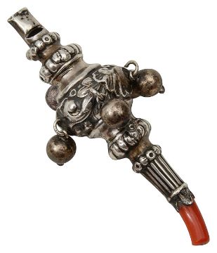 embossed decoration, suspended with five circular five plain balls, coral teether to one end