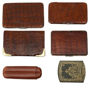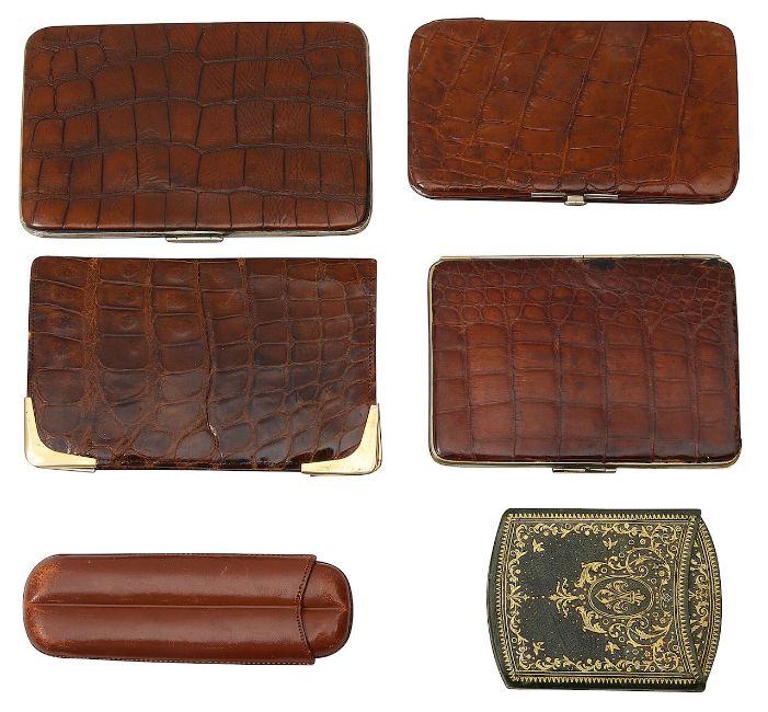 first with bearing shield shaped reserve engraved with initials, together with an Edwardian, stamped 925 and with London import mark 1904-6 silver framed crocodile wallet, bearing monogram, two other crocodile wallets, a green gilt tooled Italian card case and a leather double cigar holder, (6)