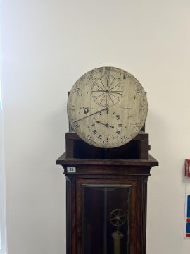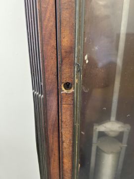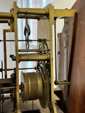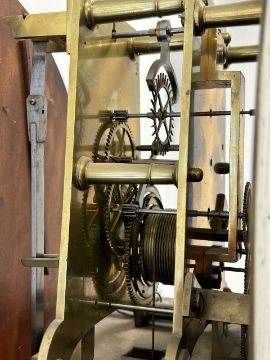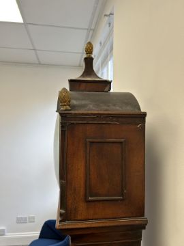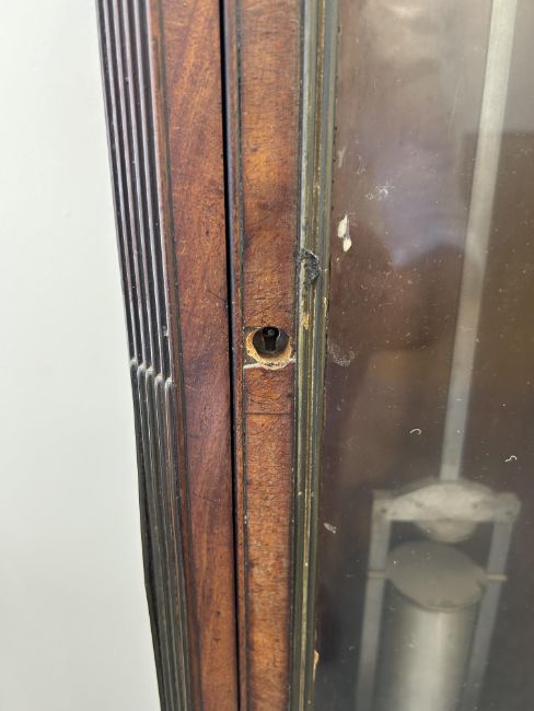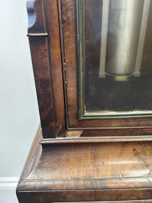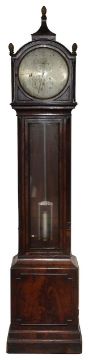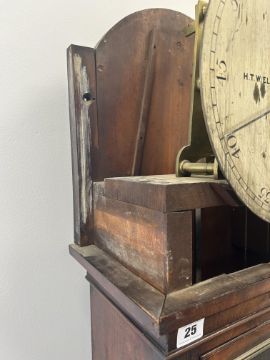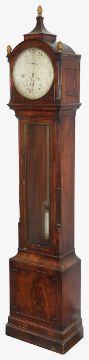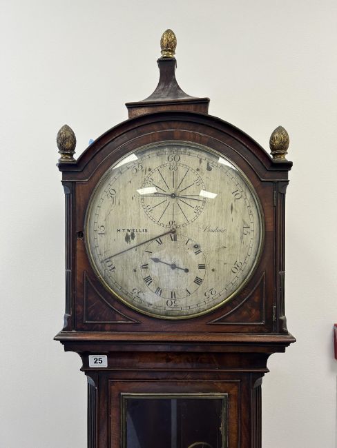 An early 19th century mahogany longcase regulator the circular 11" silvered dial with Arabic and Roman numerals, with central seconds over hours dials within outer minute track and blued steel hands, signed H.T.W. Ellis London, single train 8 day brass six pillar movement with deadbeat escapement and dust cover, the steel pendulum rod with mercury compensated glass jar pendulum and brass cased weight supported on a six spoked brass pulley, the arched hood surmounted with three gilt brass pineapple finials over a trunk with glazed door and reeded canted sides, on a box base with raised outline moulding on plinth height 205cm., width 44.5 cm., depth 23.5 cm. Condition:Winds ticks and runs however no guarantee can be offered as to the full working order. No case key. Winding key later. Original seat board. Case unrestored with chips and losses to veneer. Section of moulding loss to side of hood, another loss to moulding on the plinth base on one side. LARGE ITEMS (W lots) are available for collection the day after the sale, from 17th October.