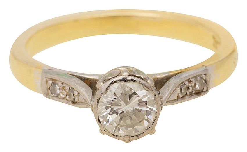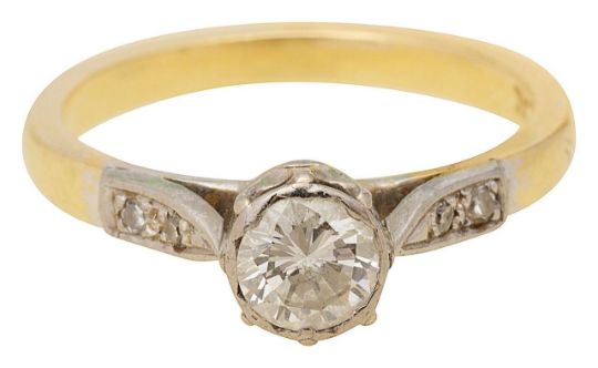 central round brilliant-cut diamond, bezel set to tapered diamond set shoulders, to a plain shank stamped "18ct&PLAT"