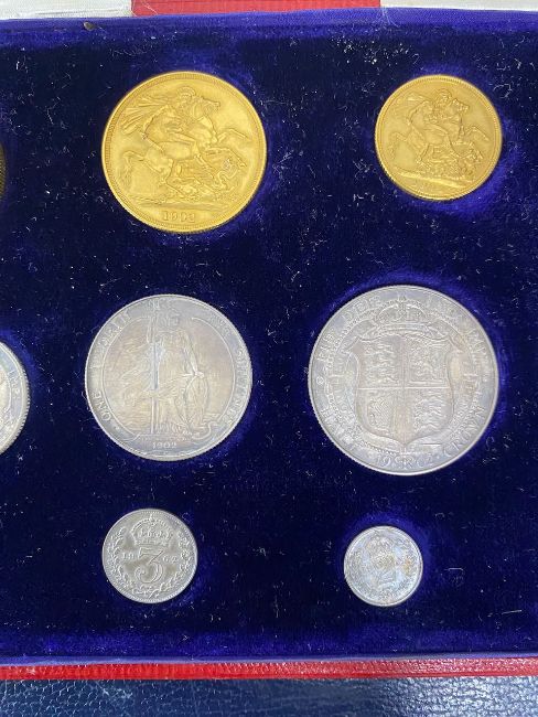 comprising gold £5, Double sovereign, sovereign and half half sovereign, silver crown, half crown, florin, shilling sixpence and four coin Maundy set in red leather grained leather case of issue stamped in gilt Specimen Coins 1902 with Imperial Crown